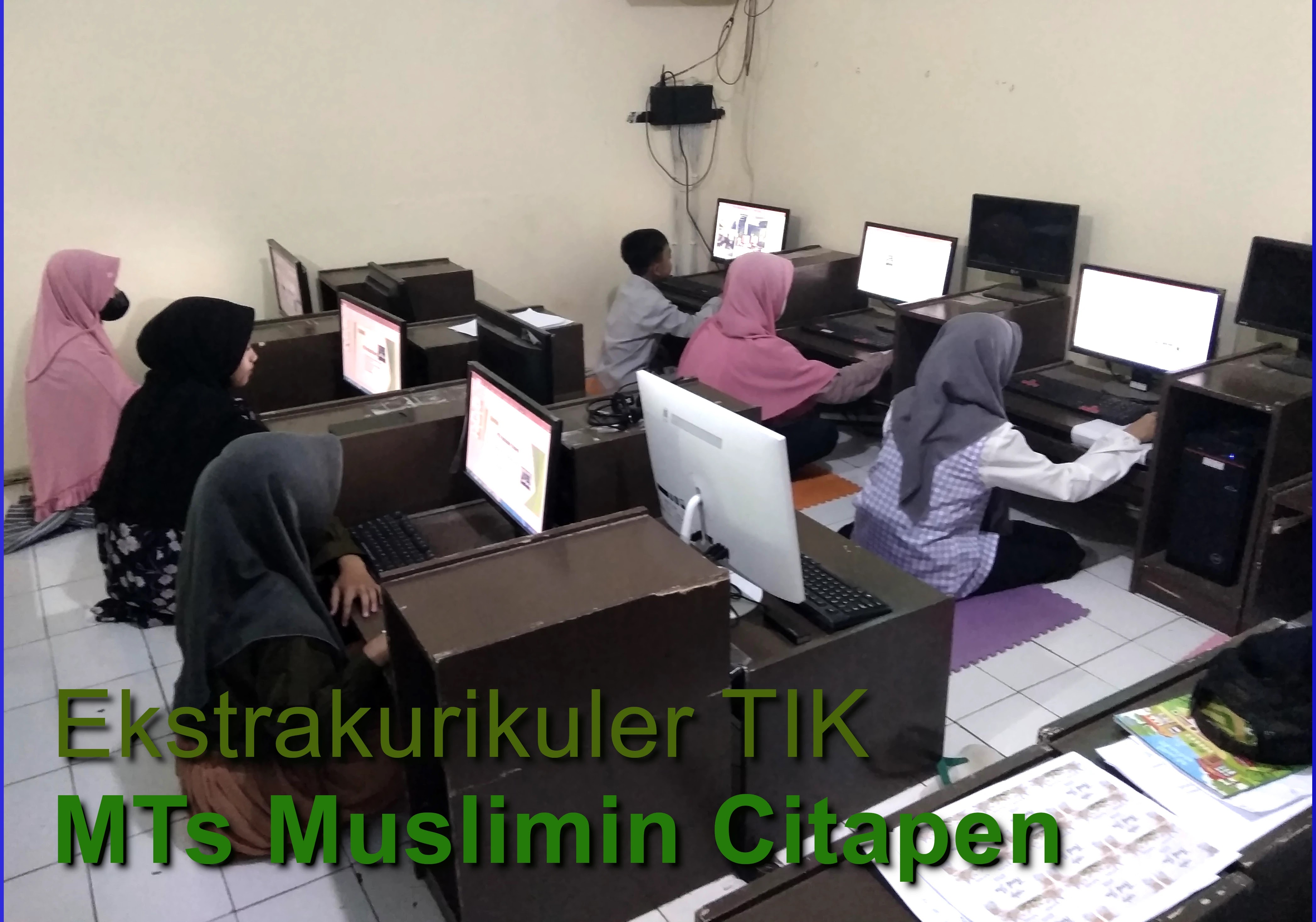 | Siswa-siswi MTs Muslimin Citapen sedang praktek ekskul TIK: membuat profil madrasah dengan Microsoft Power Point.* |